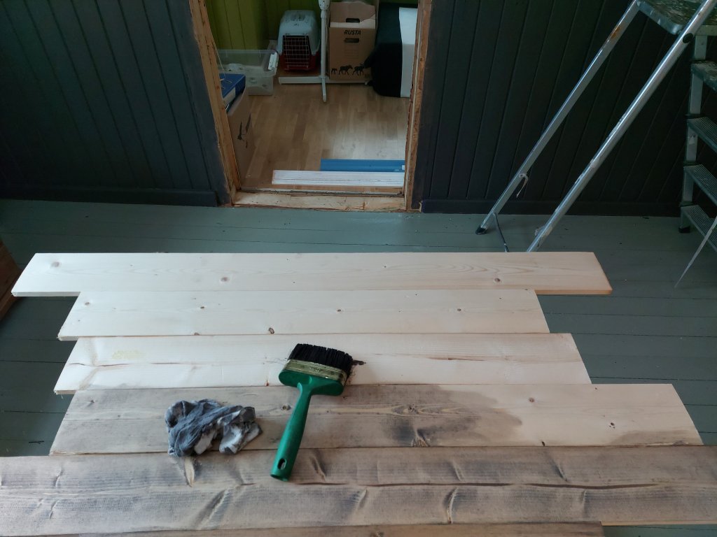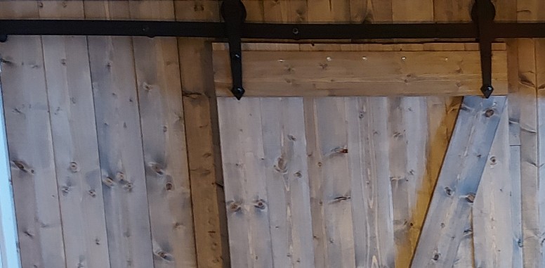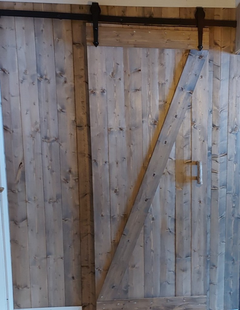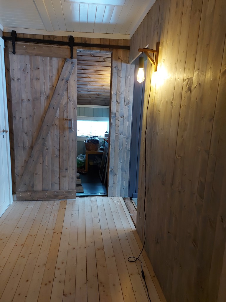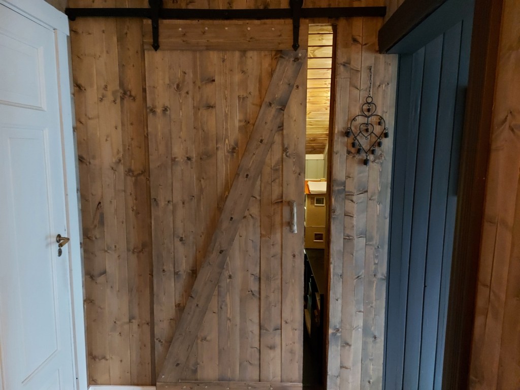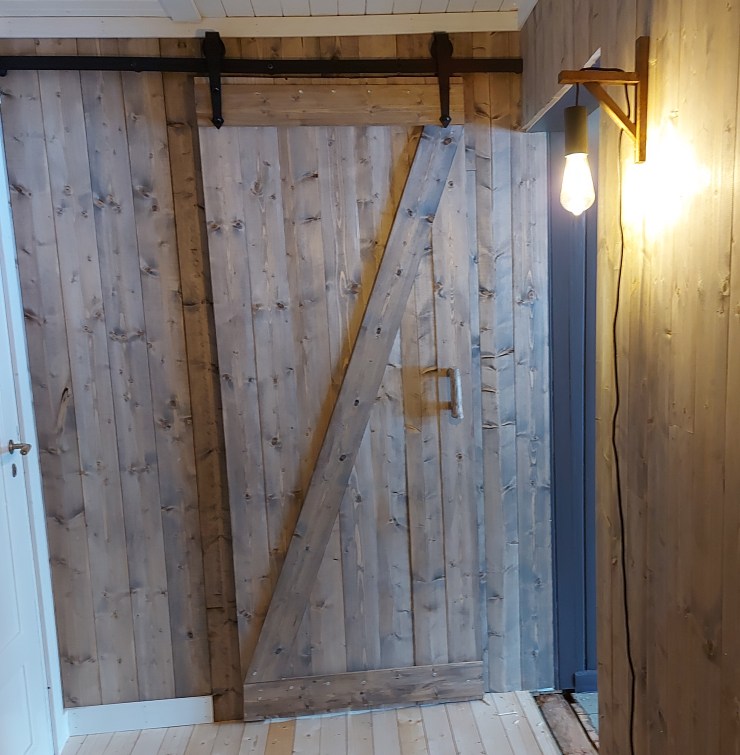 Her har vi brukt kledningsbord 123X16. De ble beiset og tørket av med fargen Lys Varde fra Tyrilin. Vi skrudde bordene sammen med med 30 mm skruer. Håndtaket er fra en bit gammelt treverk vi fant i uthuset. Vi kjøpte dørskinne og oppheng på VidaXL