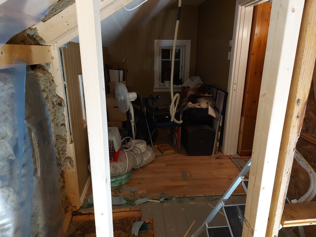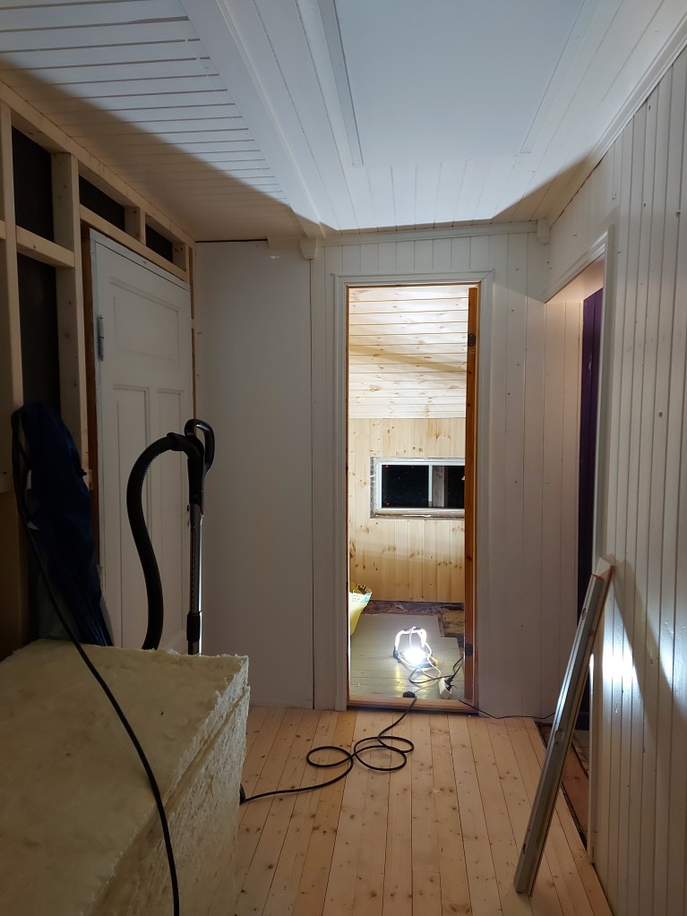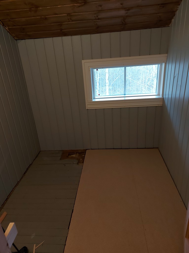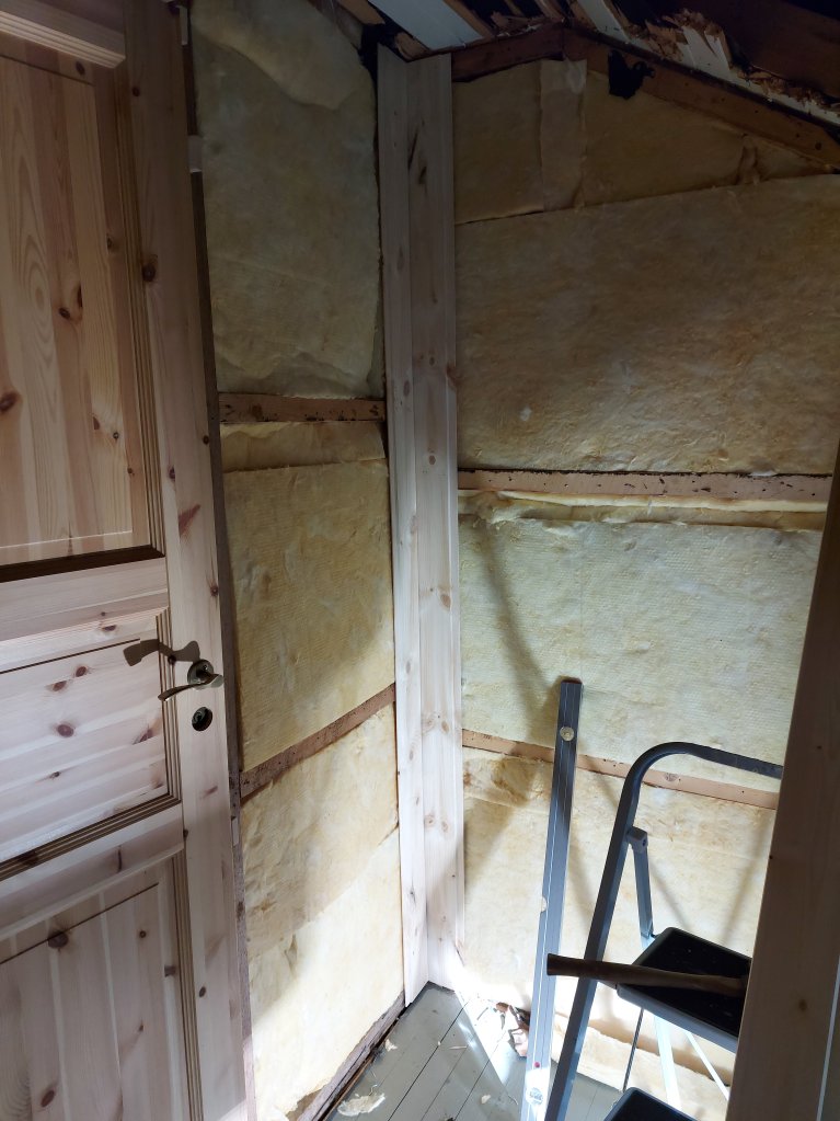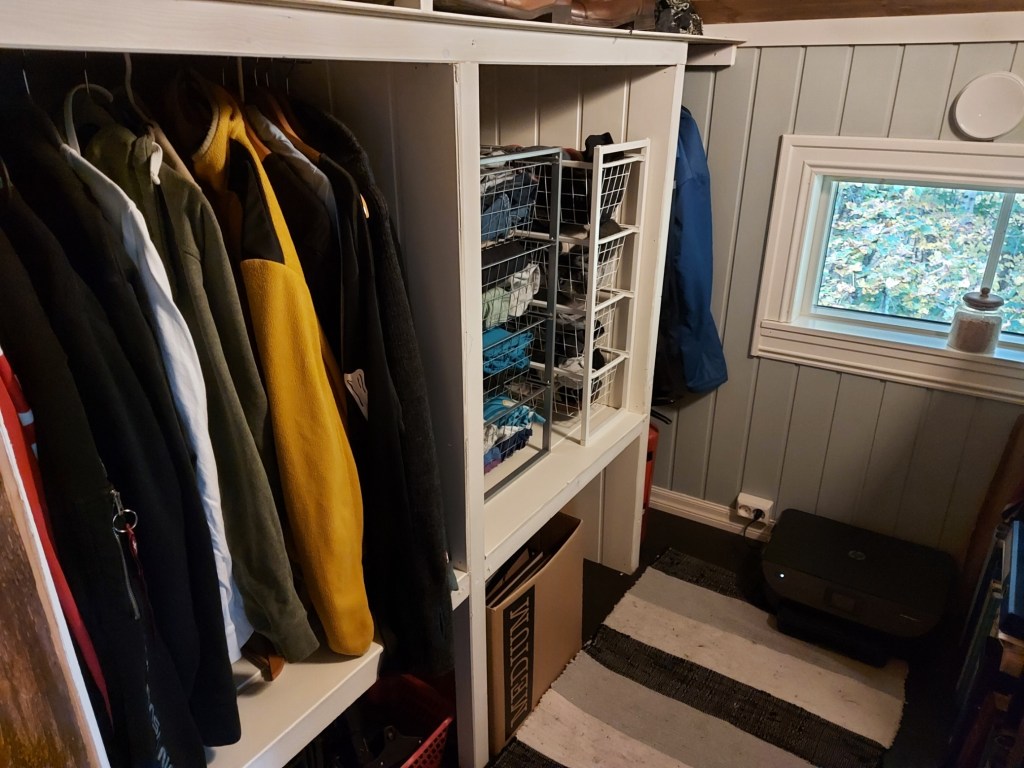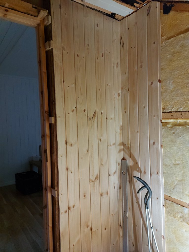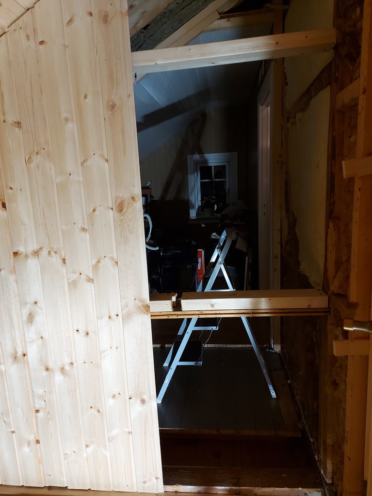 Boden var det mest uferdige rommet i huset da vi kjøpte det. Her manglet både isolasjon, panel og gulv. Her har det antagelig vært vannskade tvers gjennom huset, fra tak til 1. etasje. Det har vært en del råte. En stor del var allerede utbedret i tak,gulv og stuetaket nede. Nytt vindu var også satt inn. Vi utbedret takbjelke og gulvbjelke. Vi isolerte veggene og gulvet. Satte på ny panel og la nytt gulv. Vi har bygd inn klesskap og oppbevaring for turutstyr.