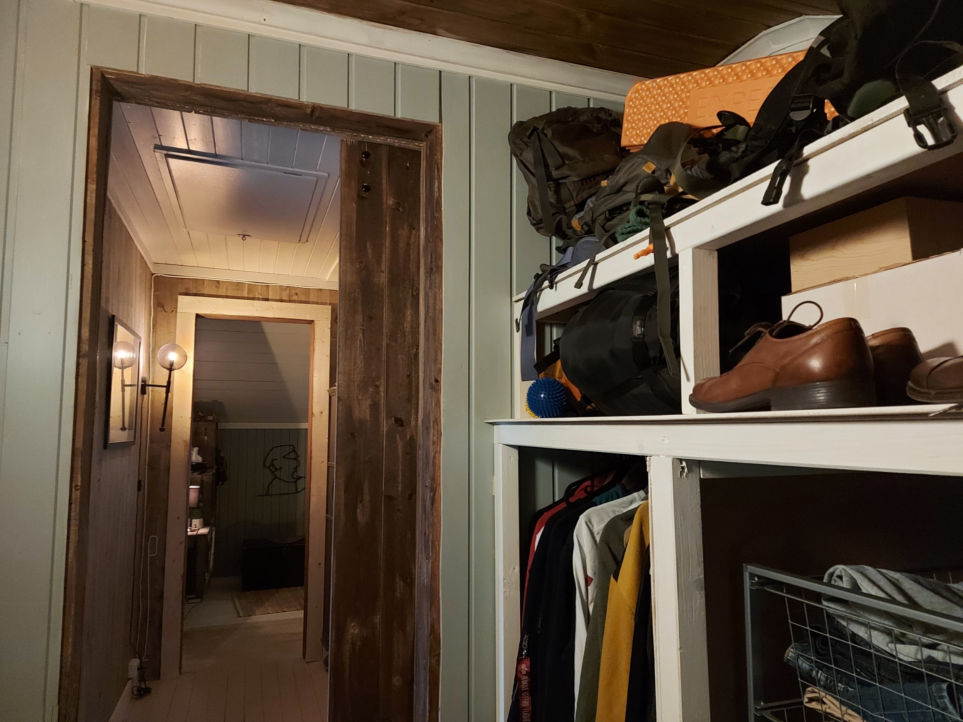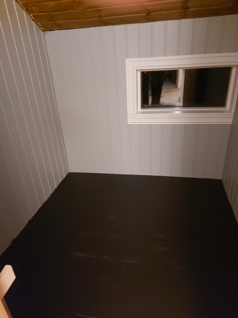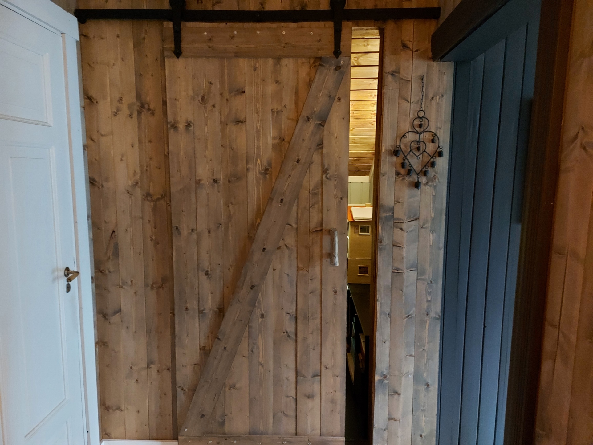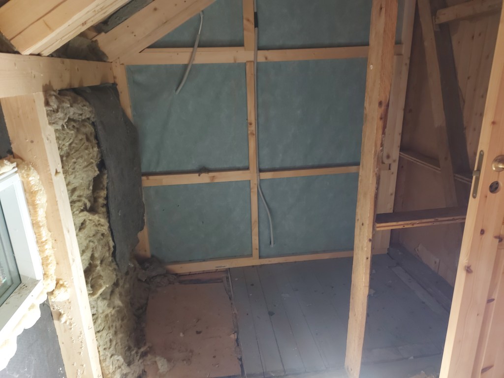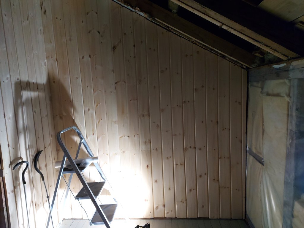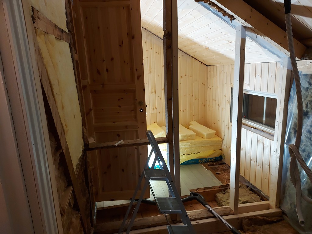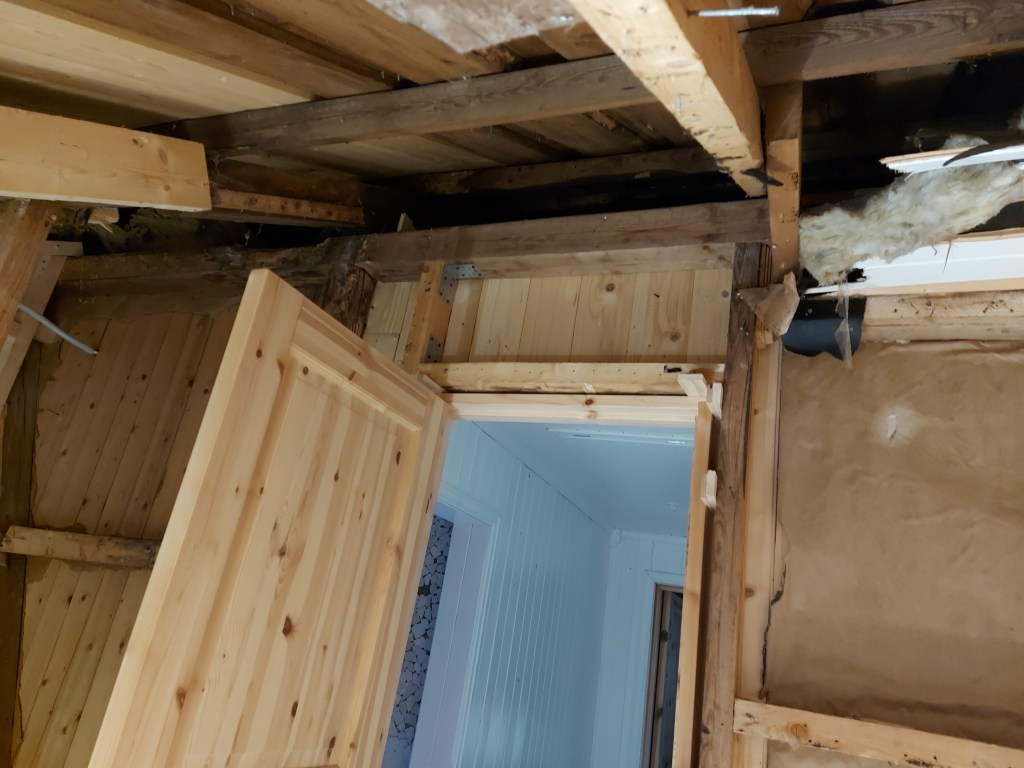 Boden var det mest uferdige rommet i huset da vi kjøpte det. Her manglet både isolasjon, panel og gulv. Her har det antagelig vært vannskade tvers gjennom huset, fra tak til 1. etasje. Det har vært en del råte. En stor del var allerede utbedret i tak,gulv og stuetaket nede. Nytt vindu var også satt inn. Vi utbedret takbjelke og gulvbjelke. Vi isolerte veggene og gulvet. Satte på ny panel og la nytt gulv. Vi har bygd inn klesskap og oppbevaring for turutstyr.