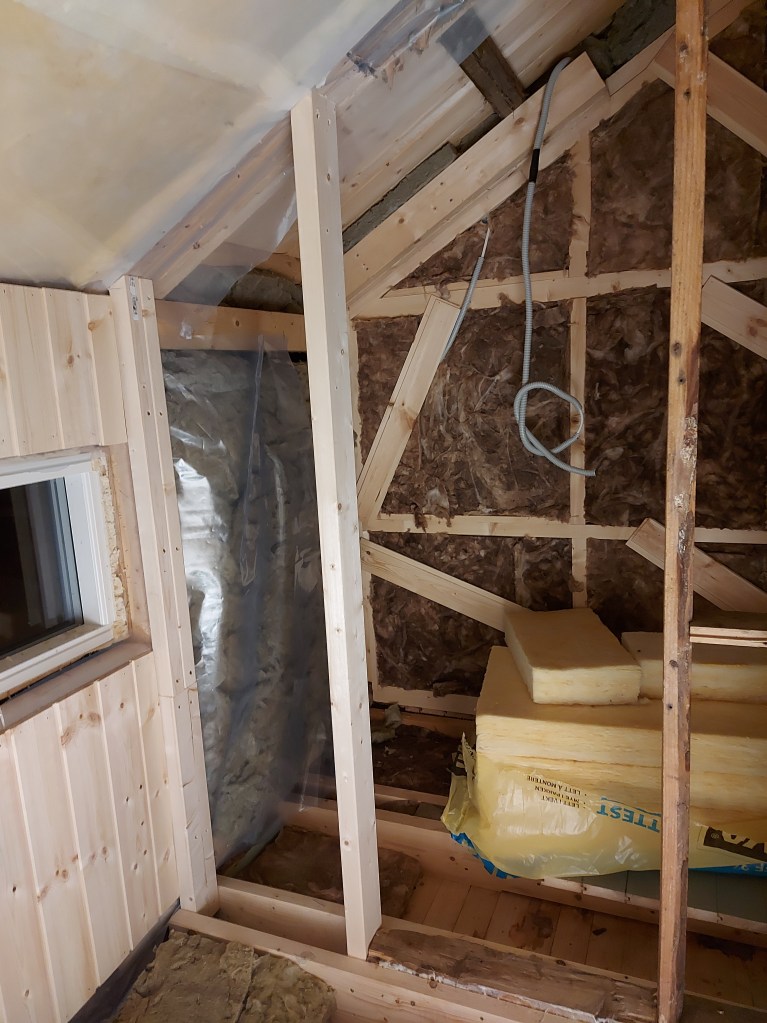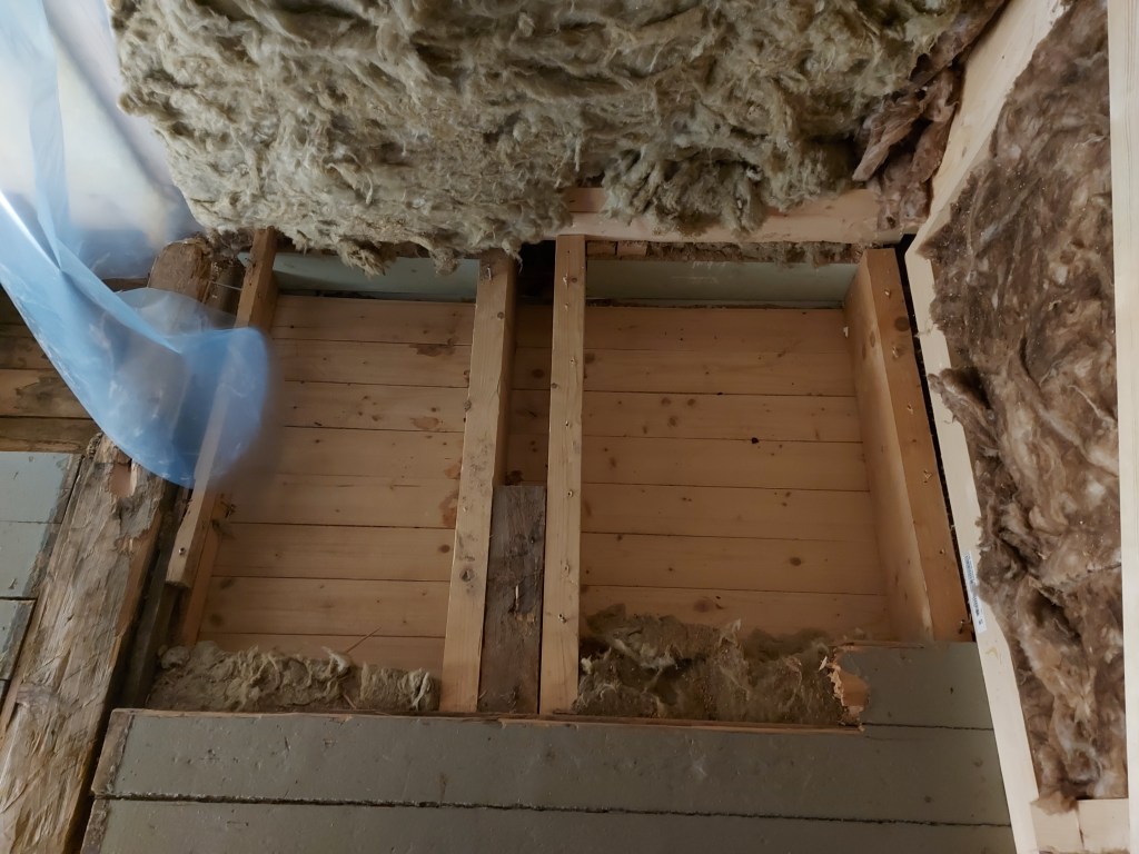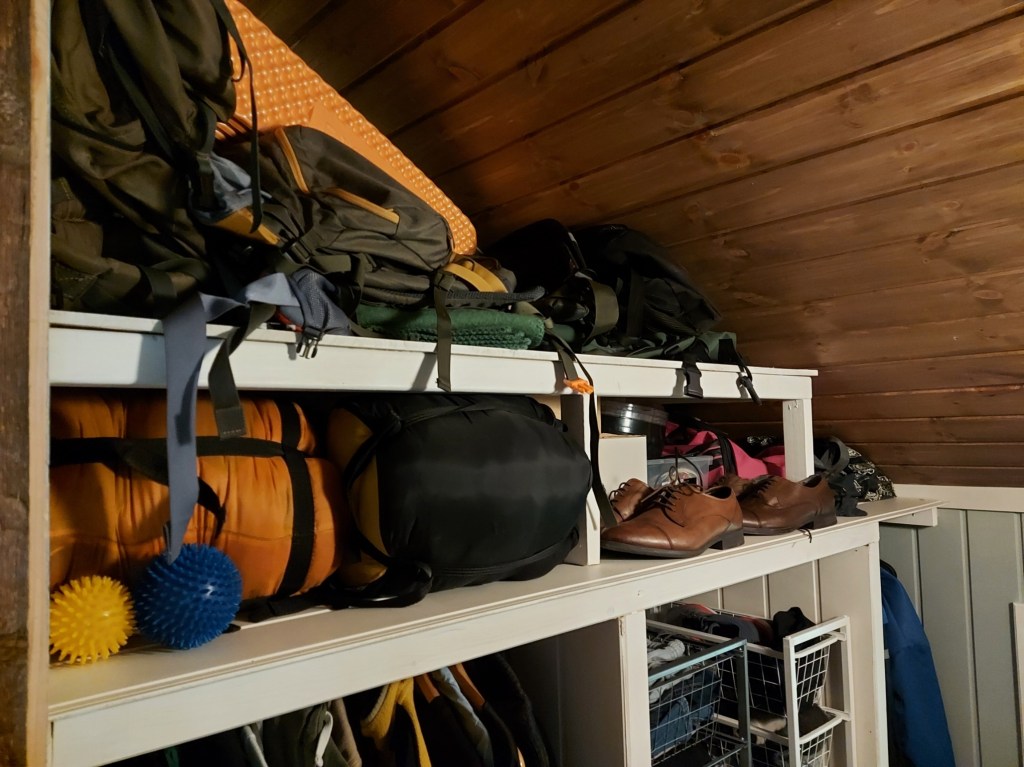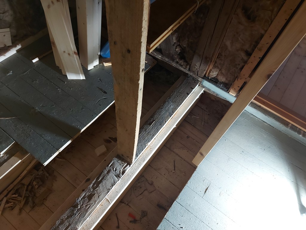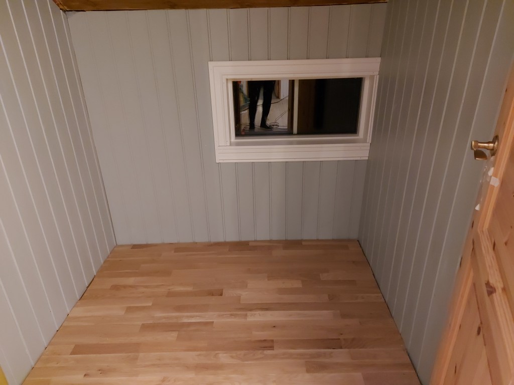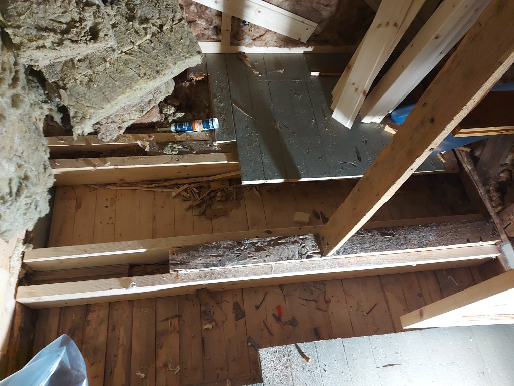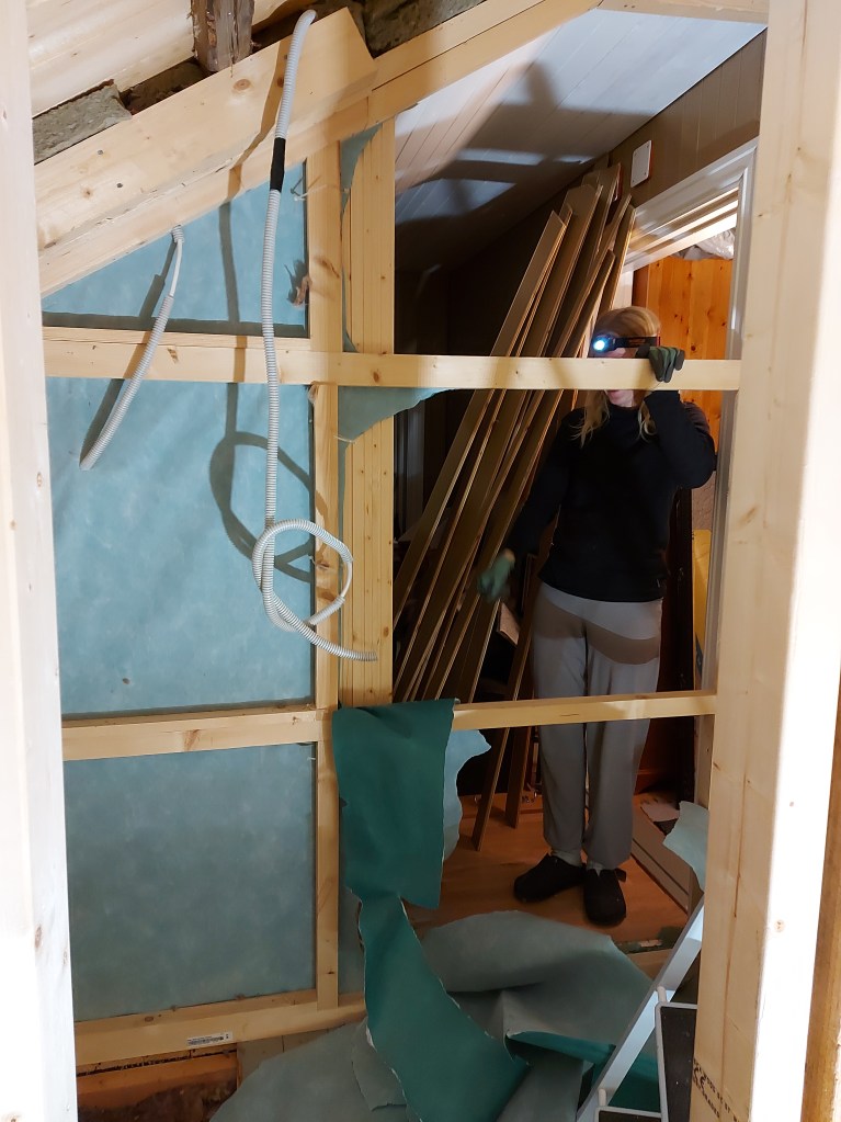 Boden var det mest uferdige rommet i huset da vi kjøpte det. Her manglet både isolasjon, panel og gulv. Her har det antagelig vært vannskade tvers gjennom huset, fra tak til 1. etasje. Det har vært en del råte. En stor del var allerede utbedret i tak,gulv og stuetaket nede. Nytt vindu var også satt inn. Vi utbedret takbjelke og gulvbjelke. Vi isolerte veggene og gulvet. Satte på ny panel og la nytt gulv. Vi har bygd inn klesskap og oppbevaring for turutstyr.