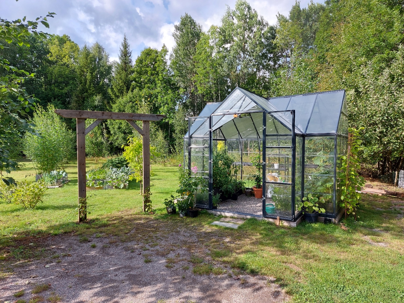 Et viktory orangeri på 11 m2. Bygde bunnsviller av impregnert 48×98. Satte det opp på pukk med duk under. Bygde 2 større plantekasser på hver langside. Drivhuset veier ikke så mye så vi festet bunnsvillene til plantekassene. Samt at vi støpte og festa bunnsvillene til 2 stolpesko.