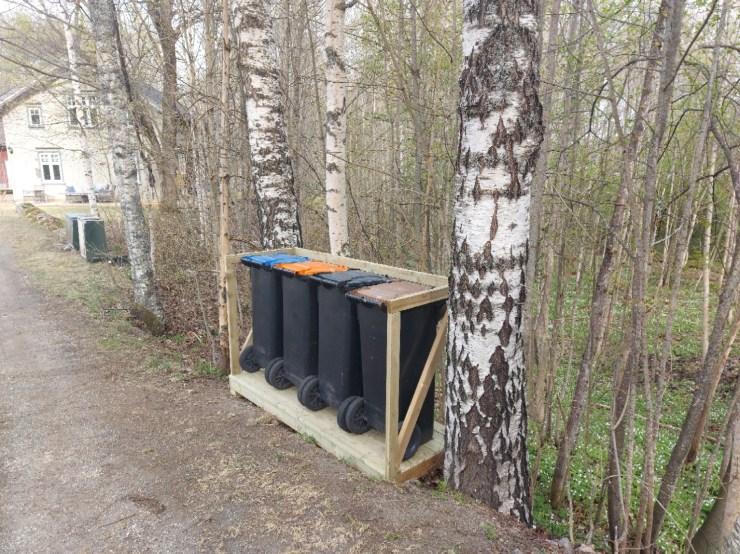 Satte sammen et åpent og enkelt søppelstativ med plass til 4 dunker. Materialer som er brukt er: Impregnert 36X68. Impregnert 48X98 og terrassebord 21X95