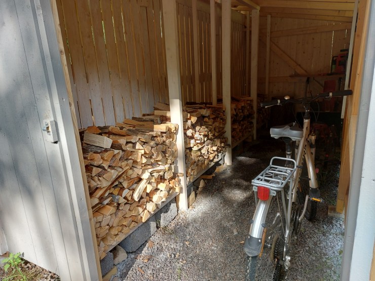 Bygde vedboden inntill carporten. Boden ble 5m x 1.80m. Gravde ned 4 støpte fundamenter for vegg (Fundament byggmax) . Brukte 48×98 som stendere og spikerslag. Og 48×148 som takbjelker. Som kledning ble det brukt vi 16×98. Som undertak brukte jeg rupanel 19×123. Så la jeg papp og shingel. Selve overgangen mellom tak carport og vedbod…