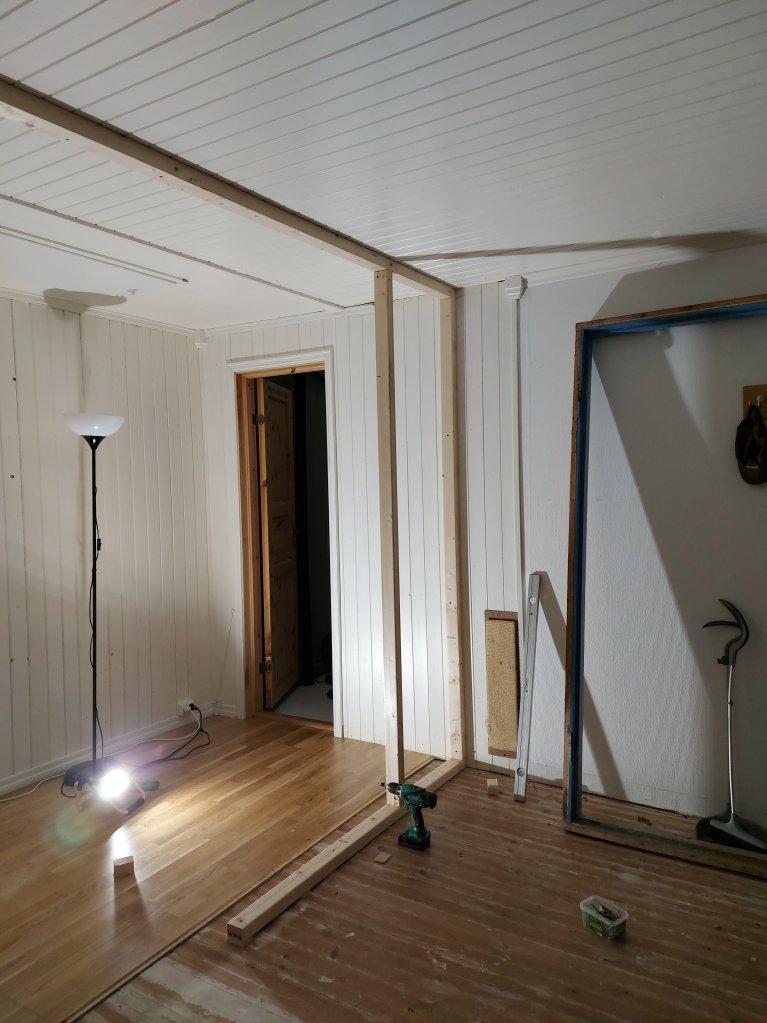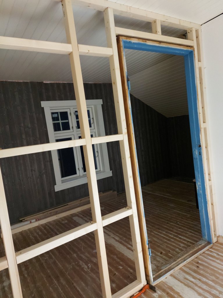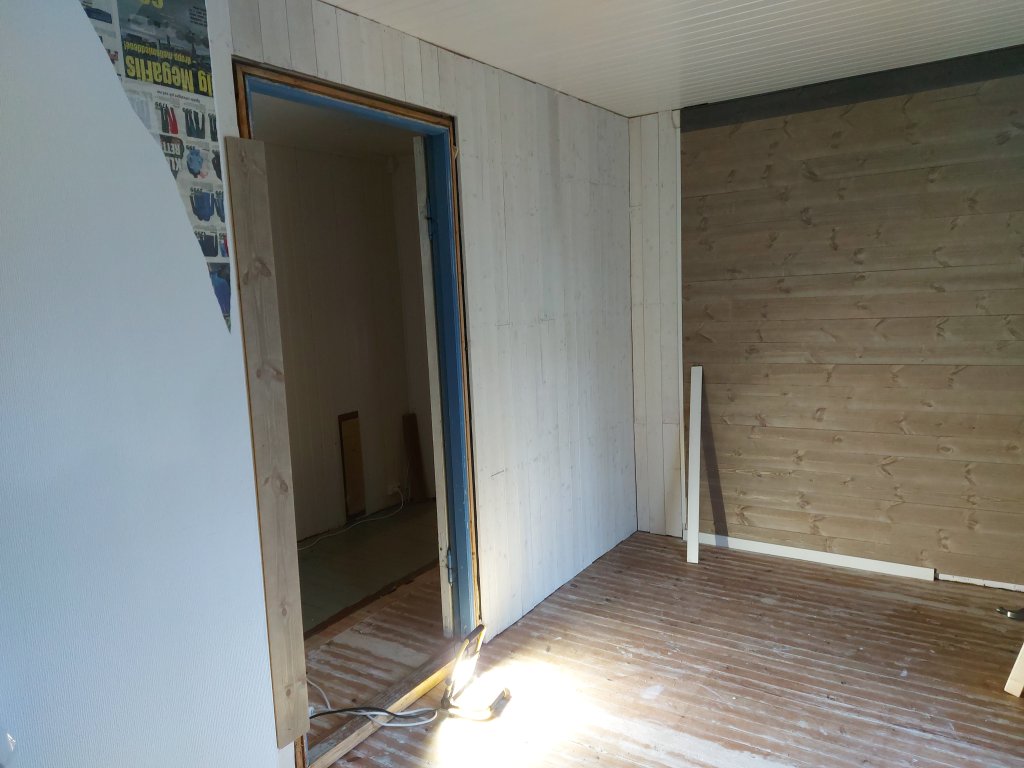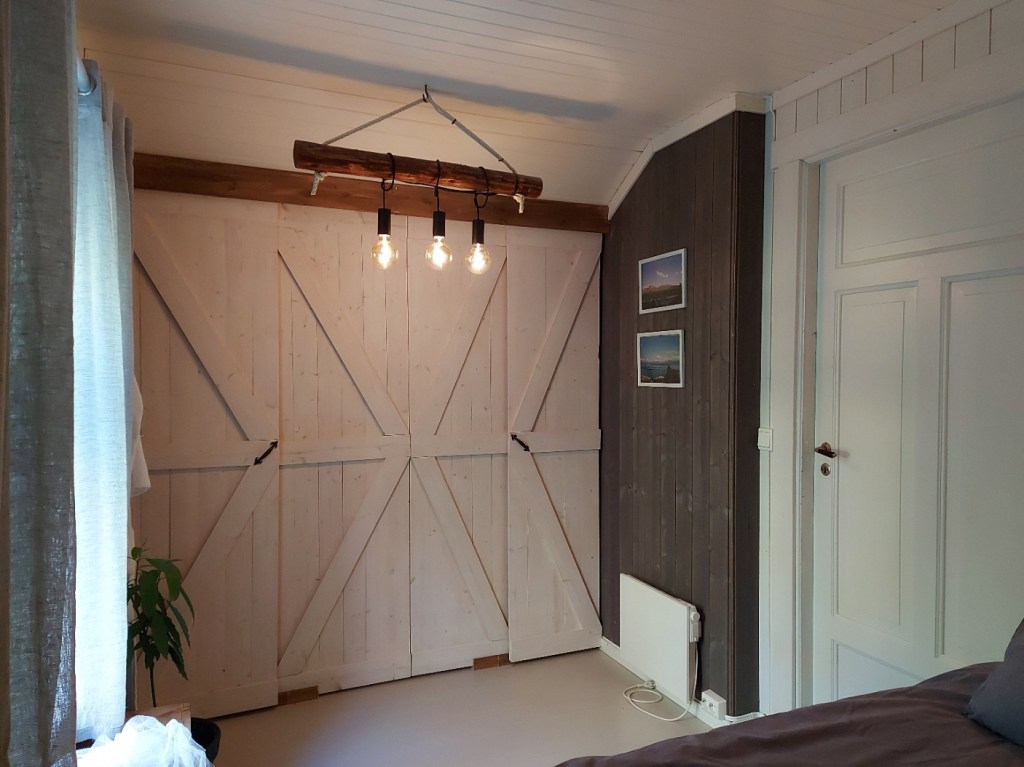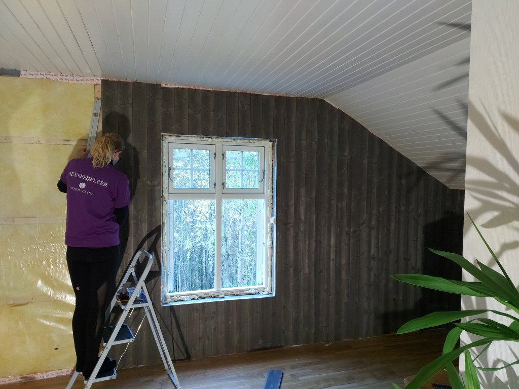 Huset hadde ingen ferdige soverom da vi overtok det, men en ‘åpen løsning’ i hele 2. etg. Vi satte opp en lettvegg, for å lage soverom 1. Vi fjernet parkett på gulvet, og avdekket fine, smale gulvbord i tre. Fra utsiden var ytterveggen uisolert og ukledd da vi kjøpte huset. Innvendig var veggene kledd med strietapet. Vi lektet ut med 5 cm, etterisolerte, plastet, og la på panel Nord mørkne på tre vegger. En vegg fikk panel Drivved, og en vegg fikk med kledningsbord.