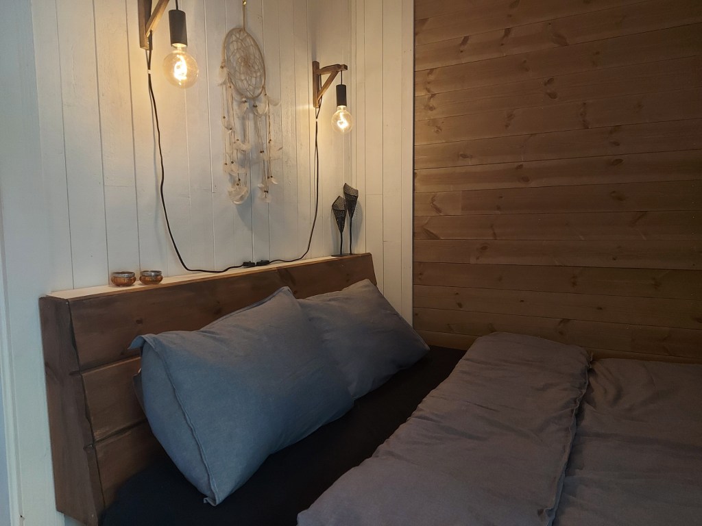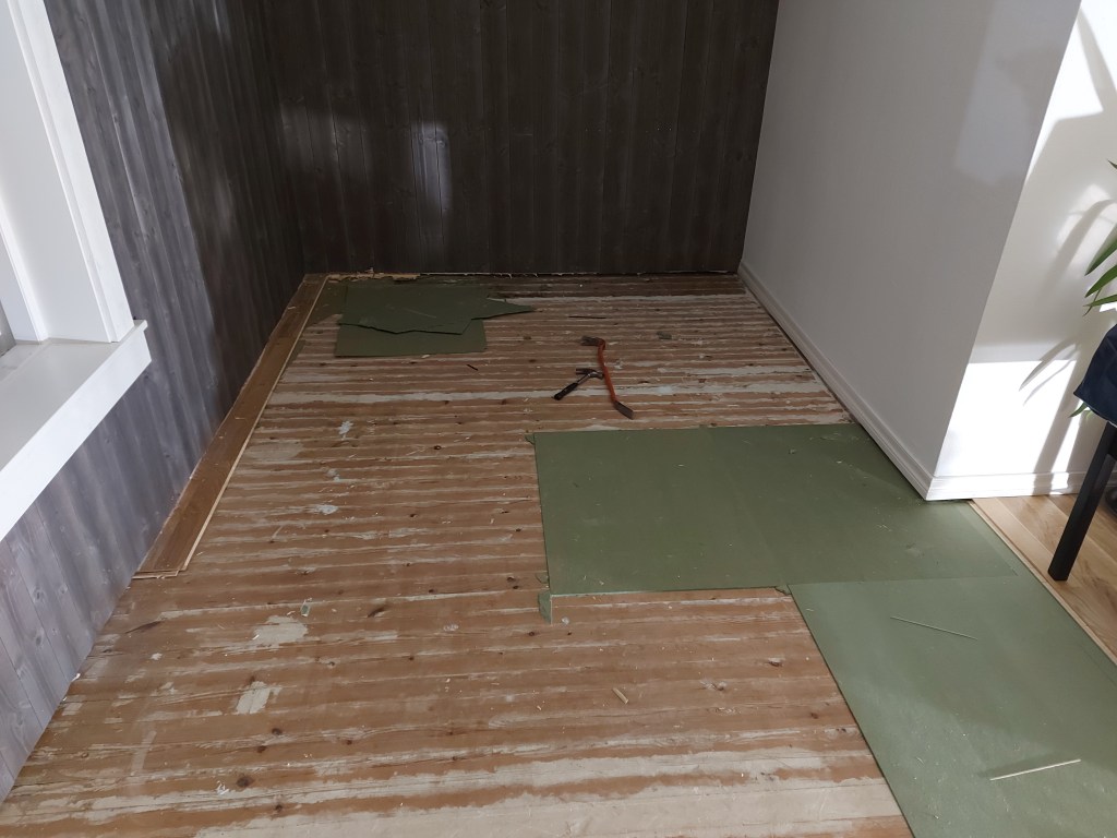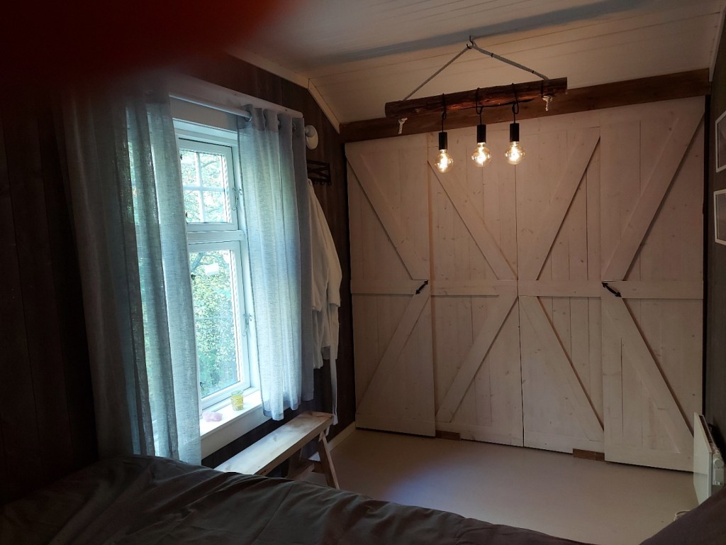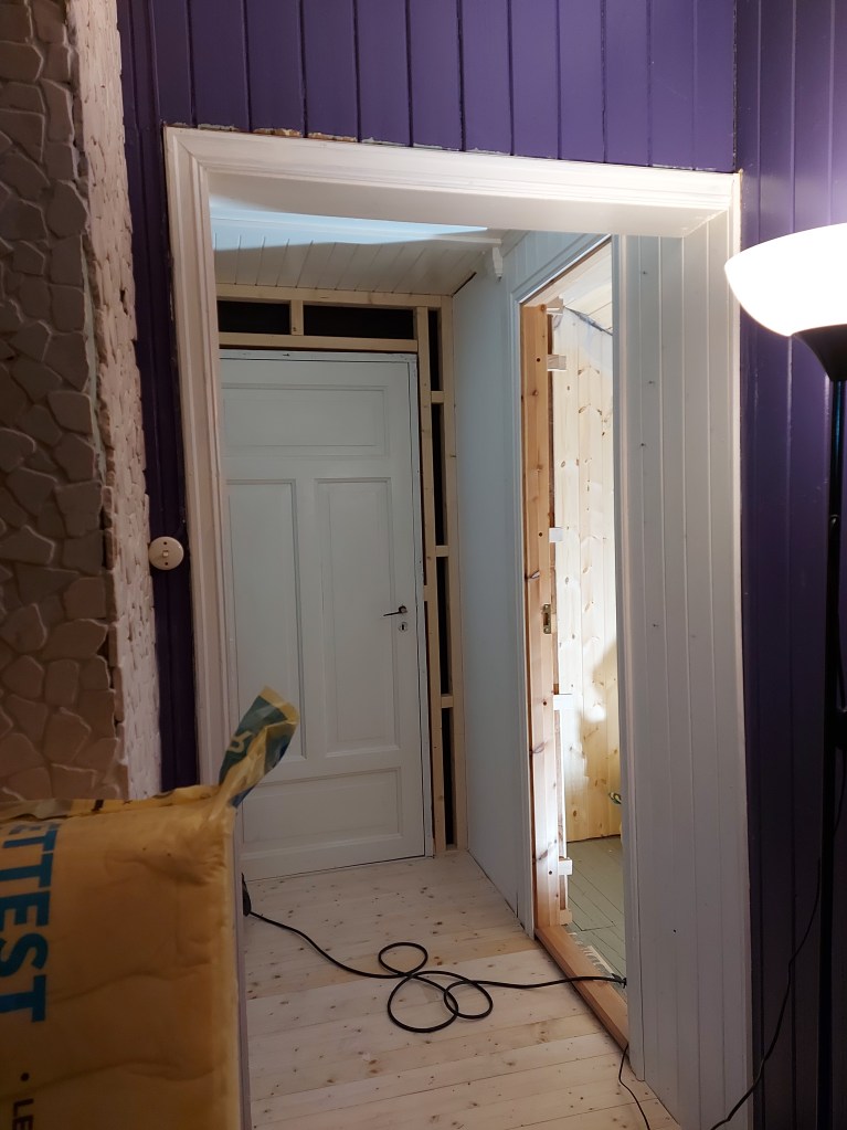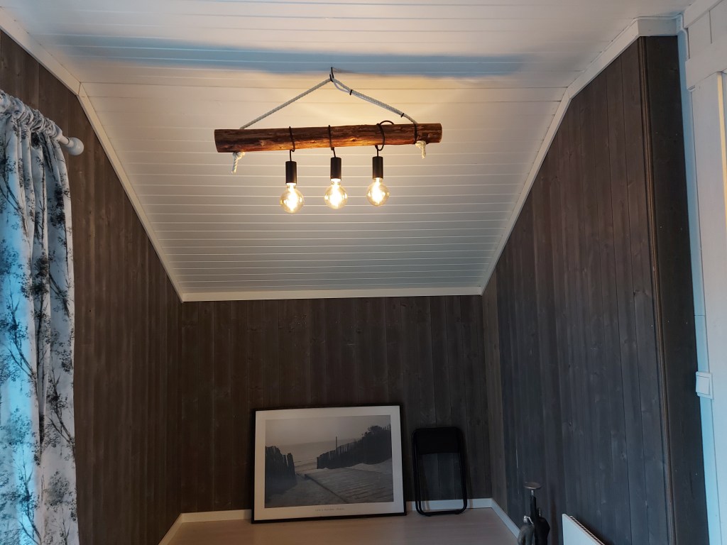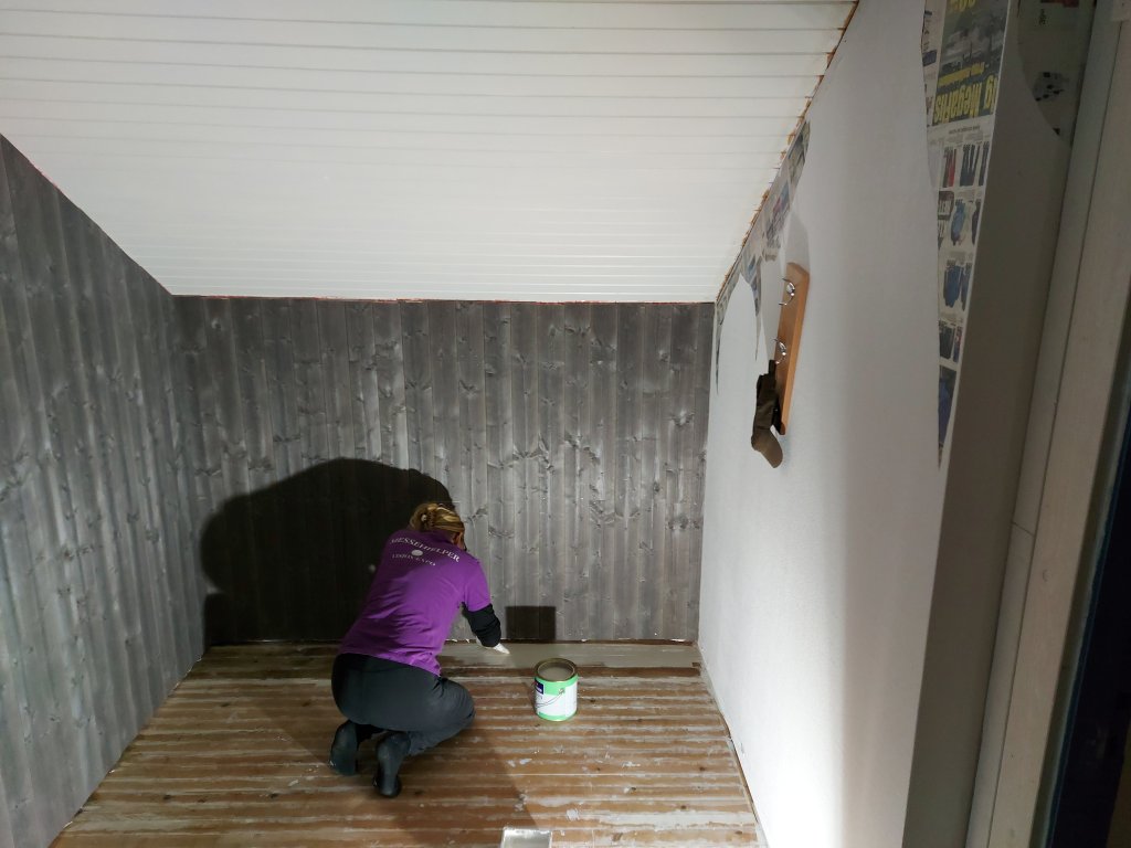 Huset hadde ingen ferdige soverom da vi overtok det, men en ‘åpen løsning’ i hele 2. etg. Vi satte opp en lettvegg, for å lage soverom 1. Vi fjernet parkett på gulvet, og avdekket fine, smale gulvbord i tre. Fra utsiden var ytterveggen uisolert og ukledd da vi kjøpte huset. Innvendig var veggene kledd med strietapet. Vi lektet ut med 5 cm, etterisolerte, plastet, og la på panel Nord mørkne på tre vegger. En vegg fikk panel Drivved, og en vegg fikk med kledningsbord.