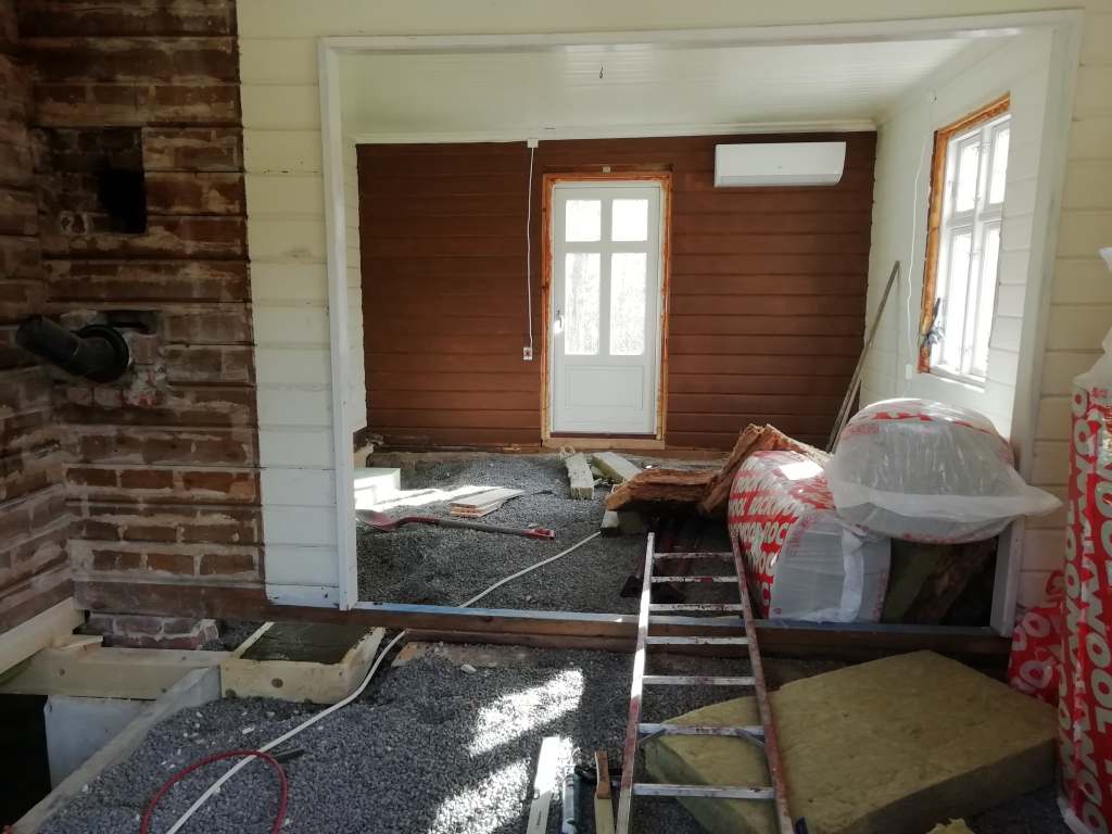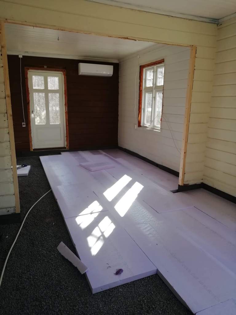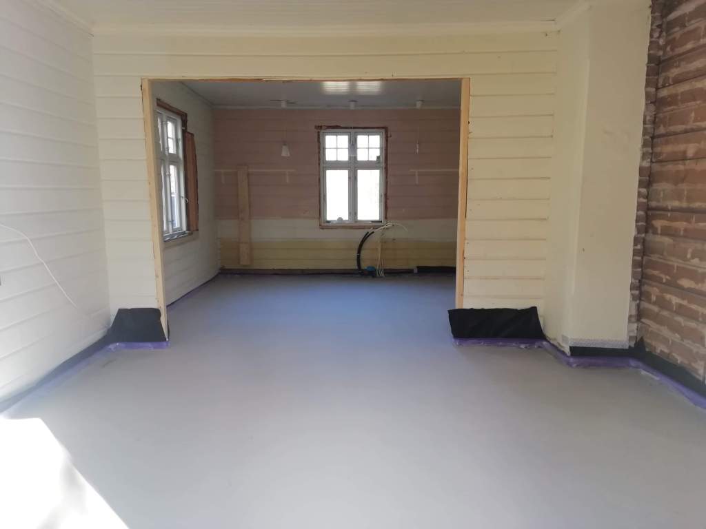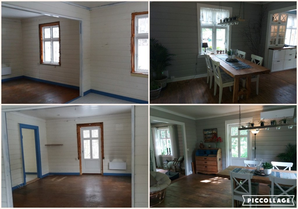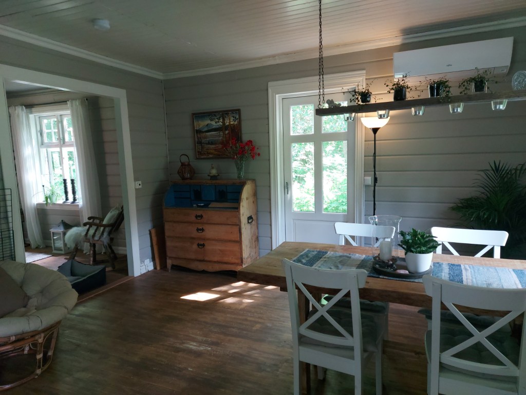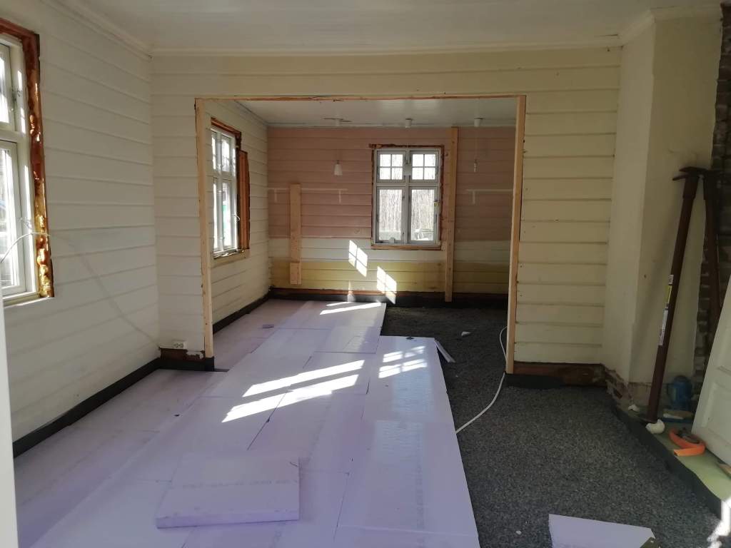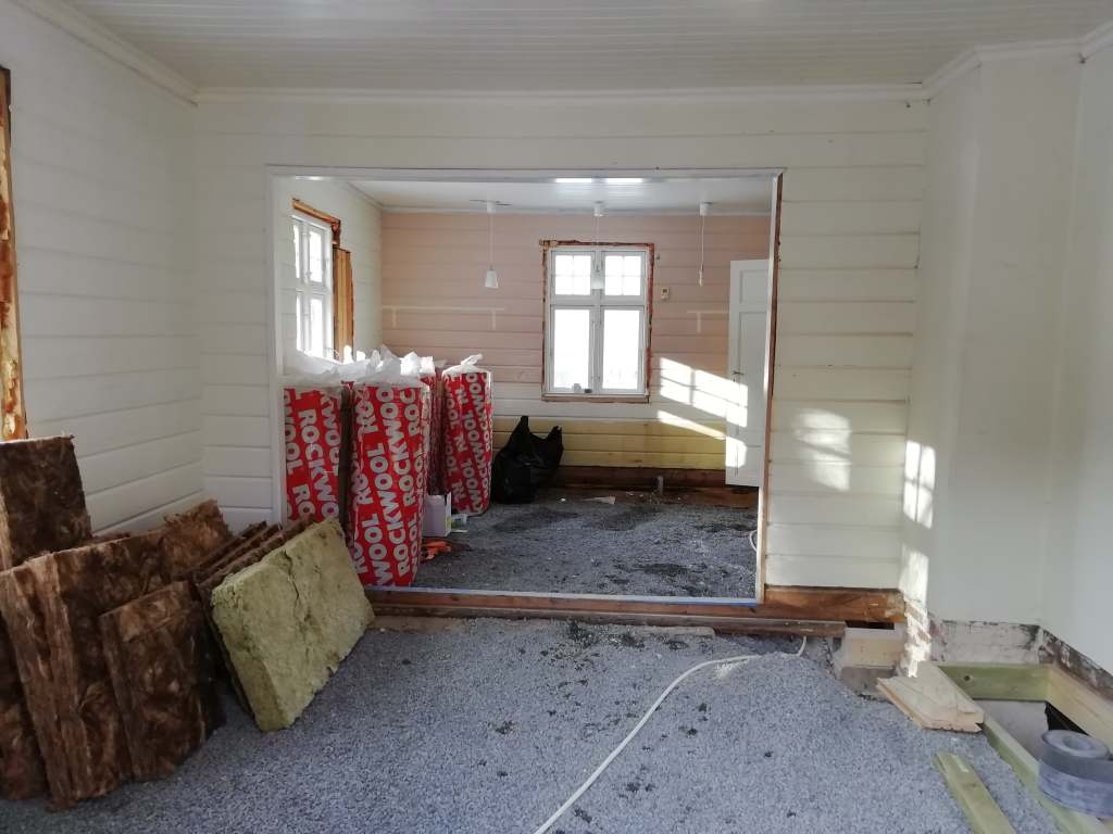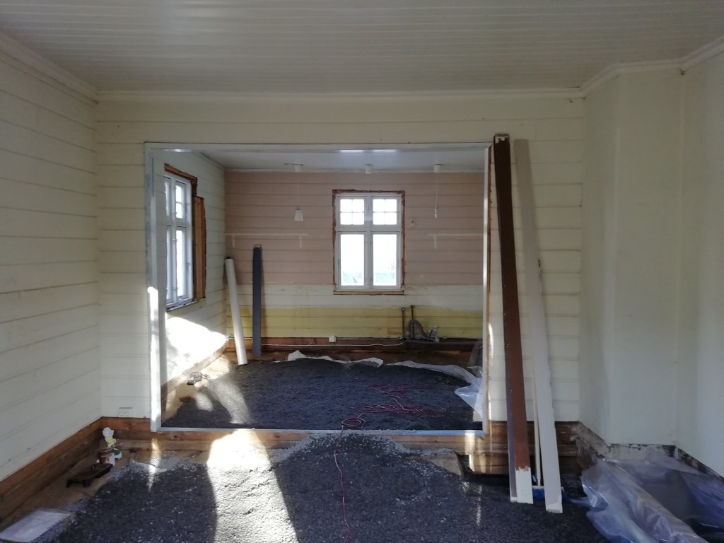 Her er gulv,bjelkelag og sagflis fjernet. Vi fylte igjen med pukk og støpte nytt gulv. Dette gjorde vi samtidig med kjøkken,gang og bad. La på heltregulv 21×95 av gran. Varmepumpe ble satt inn. Vi foret/lista dør og vindu. Til slutt malte vi vegger i kalkgrå. Spisebordet laget vi selv av 2 brede eikebord,samt at vi laget en lysplanke over spisebord som vi hengte i kjetting. Lysplanken laget vi fra gammelt treverk vi fant på tomta