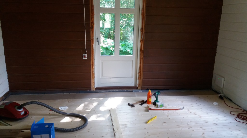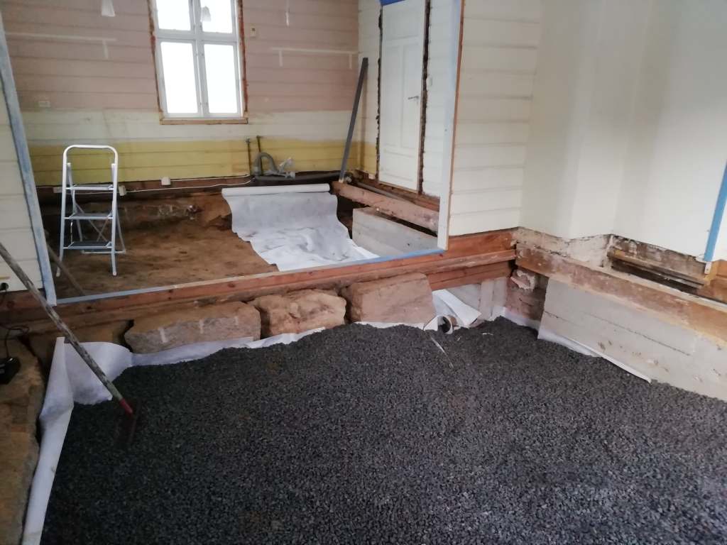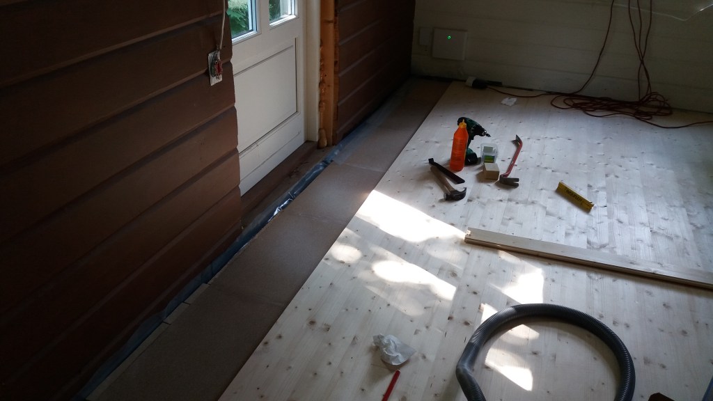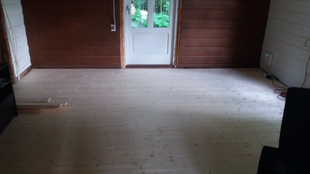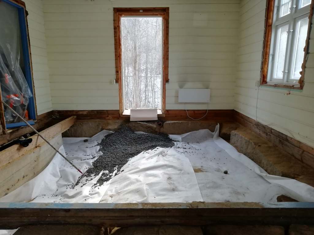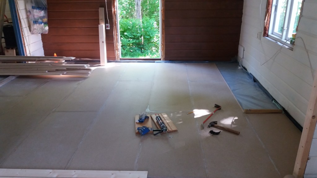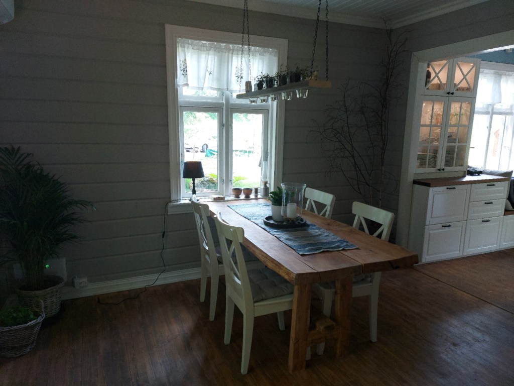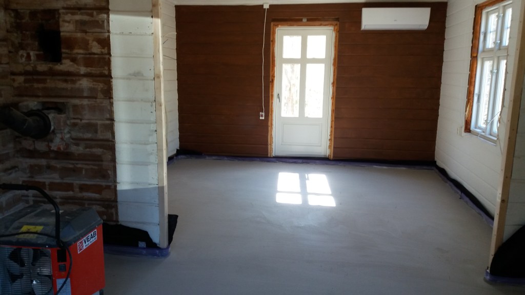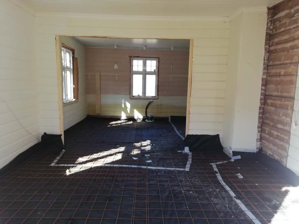Her er gulv,bjelkelag og sagflis fjernet. Vi fylte igjen med pukk og støpte nytt gulv. Dette gjorde vi samtidig med kjøkken,gang og bad. La på heltregulv 21×95 av gran. Varmepumpe ble satt inn. Vi foret/lista dør og vindu. Til slutt malte vi vegger i kalkgrå. Spisebordet laget vi selv av 2 brede eikebord,samt at vi laget en lysplanke over spisebord som vi hengte i kjetting. Lysplanken laget vi fra gammelt treverk vi fant på tomta