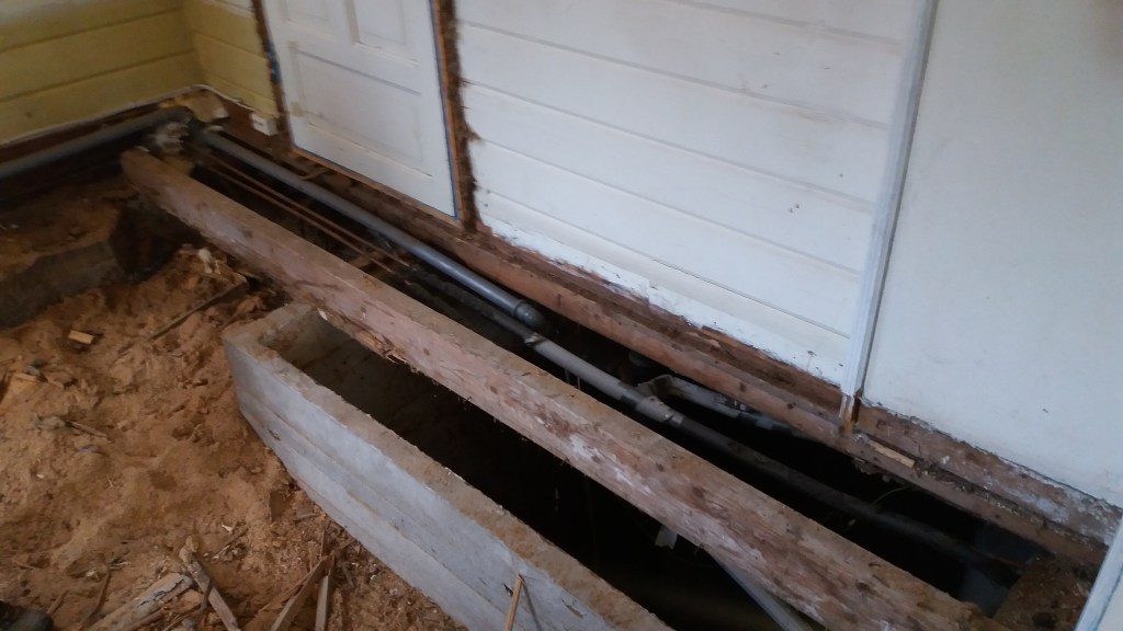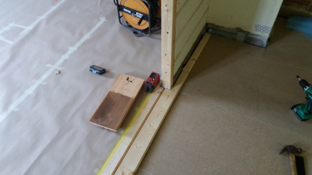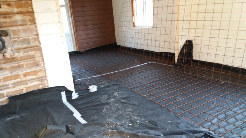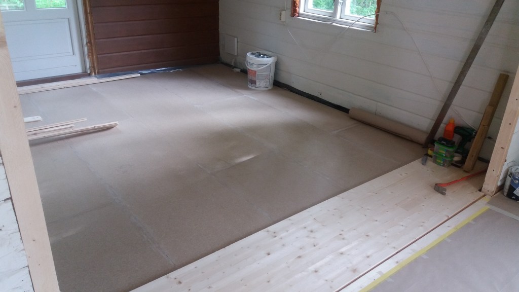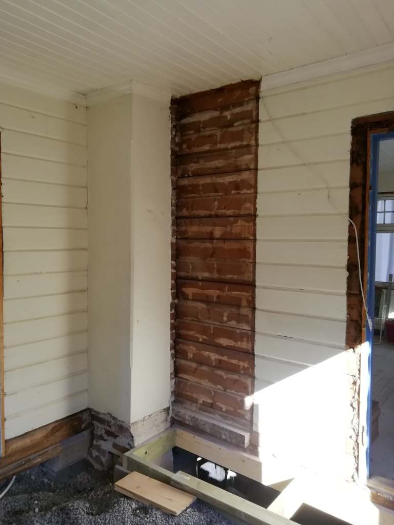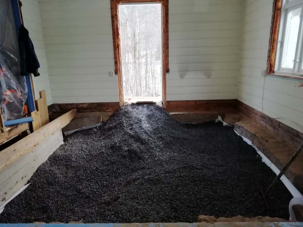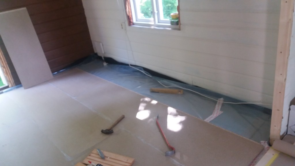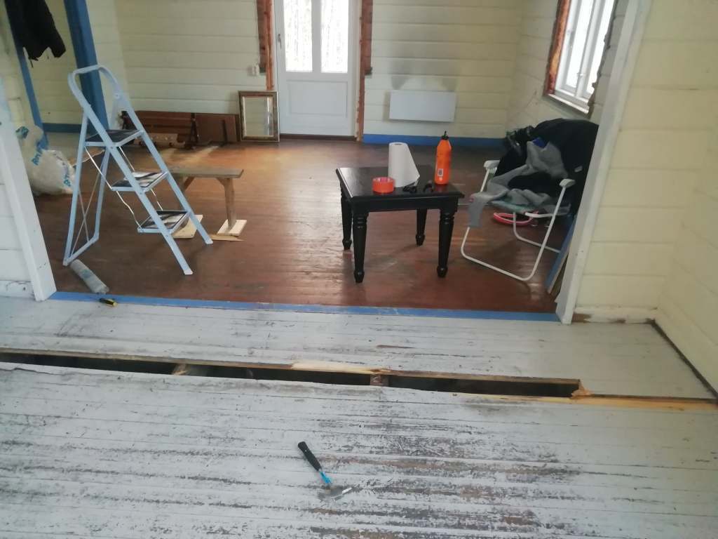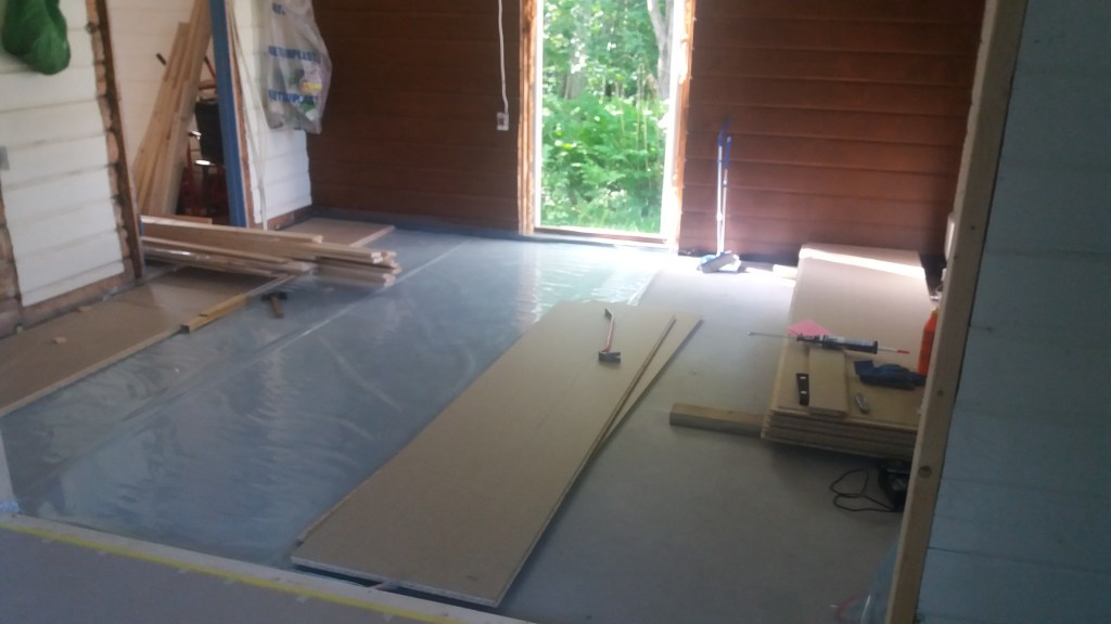 Her er gulv,bjelkelag og sagflis fjernet. Vi fylte igjen med pukk og støpte nytt gulv. Dette gjorde vi samtidig med kjøkken,gang og bad. La på heltregulv 21×95 av gran. Varmepumpe ble satt inn. Vi foret/lista dør og vindu. Til slutt malte vi vegger i kalkgrå. Spisebordet laget vi selv av 2 brede eikebord,samt at vi laget en lysplanke over spisebord som vi hengte i kjetting. Lysplanken laget vi fra gammelt treverk vi fant på tomta